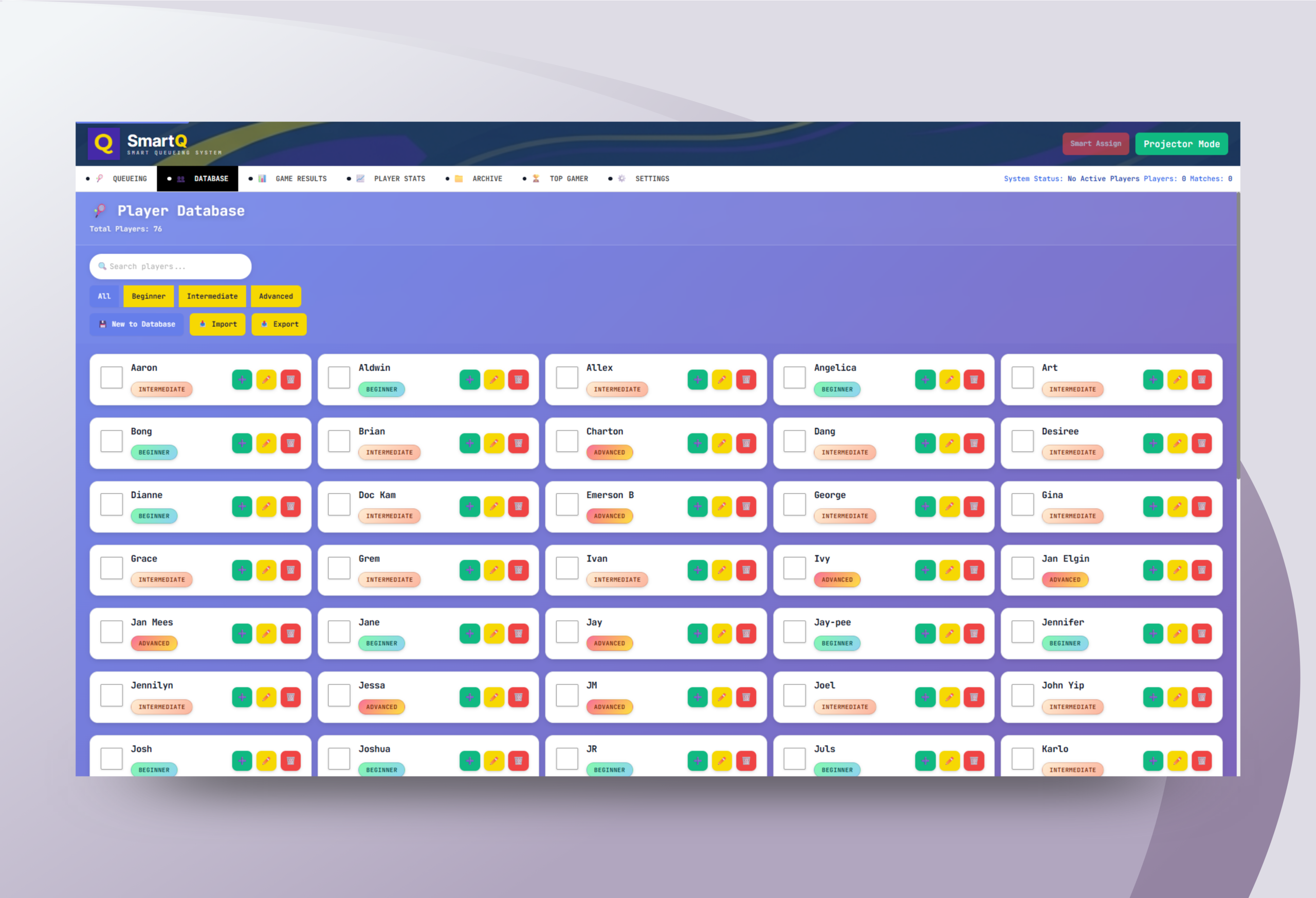 Import, export, or manually input player details and set their skill levels. Keep your records organized and easily accessible.
