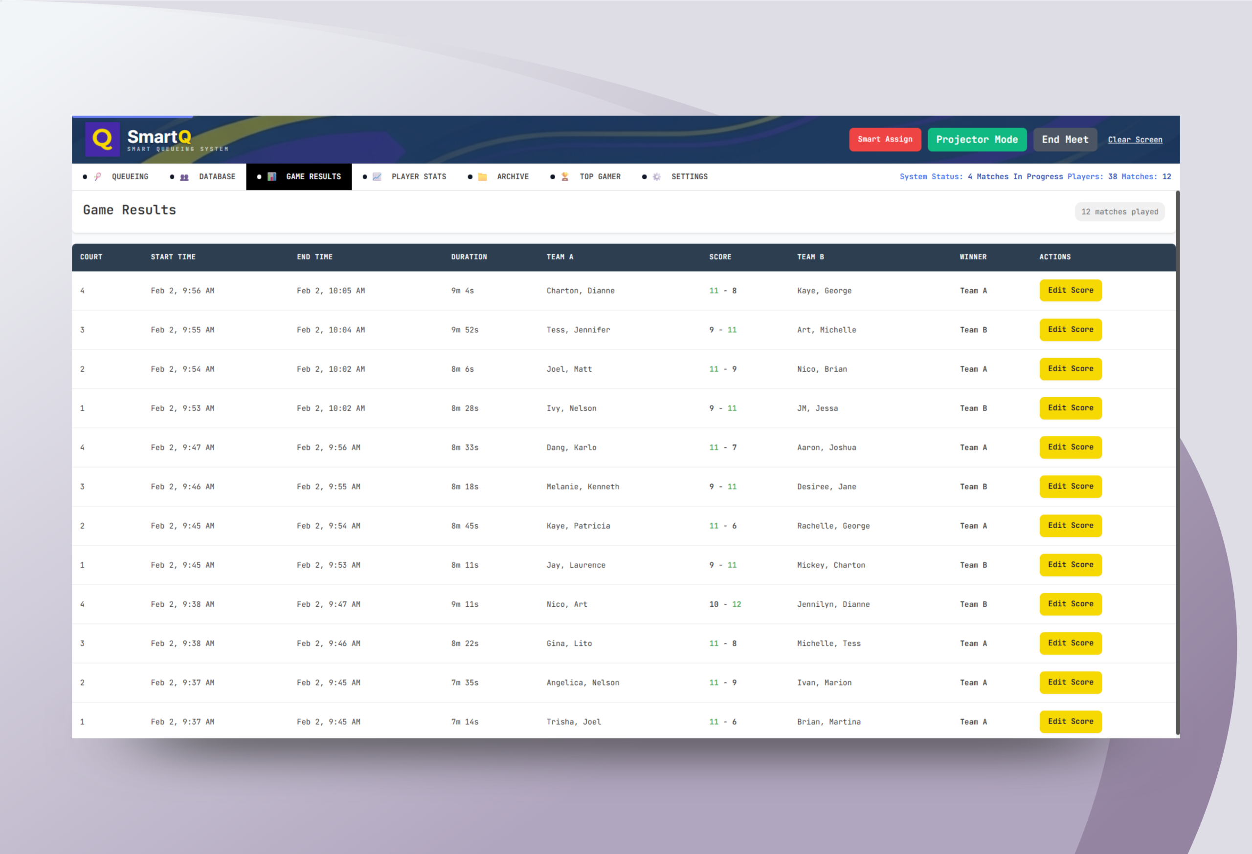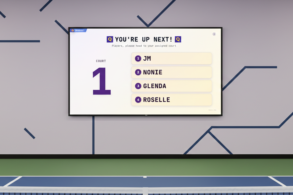 SmartQ transforms Open Play management into a seamless, high‑class experience by projecting match assignments on a large screen and pairing them with clear voice announcements. The result is not just efficiency—it’s an elevated atmosphere that makes your club look modern, organized, and truly distinguished